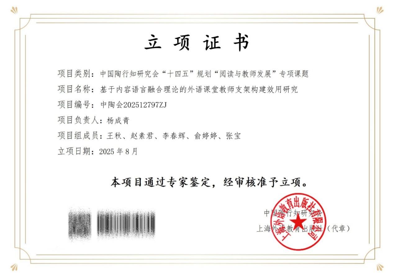 近日,中国陶行知学会“十四五”规划“阅读与教师发展”专项课题立项结果正式公布,人文与管理学院公共外语教研室杨成青老师申报的课题《基于内容语言融合理论的外语课堂教师支架构建效用研究》(项目编号:中陶会202512797ZJ)成功获批立项。据悉,这是杨成青老师在“内容语言融合理论”研究领域第三次获得课题立项,充分彰显了其在该学术领域的身后积累与研究实力。